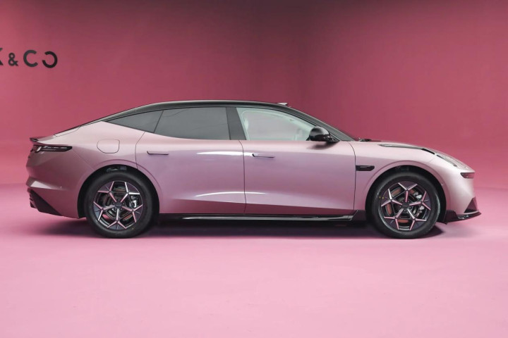 侧面前悬稍短,后悬较长,车顶大溜背设计,看着比较舒服,车窗水切线在B柱之后往上延伸,配合较宽的肩线,主打的是运动感,尤其是跟撞色车顶以及花瓣轮毂搭配,运动氛围营造的不错。采用很多人不喜欢的隐藏式门把手设计。车尾宽大厚重,尾箱顶端有小鸭尾造型,贯穿尾灯同样很醒目,下包围扩散器进一步提升运动感。新车提供极夜黑、流体灰、璃光紫、拂晓白、天云米和鎏光金共6种选择。